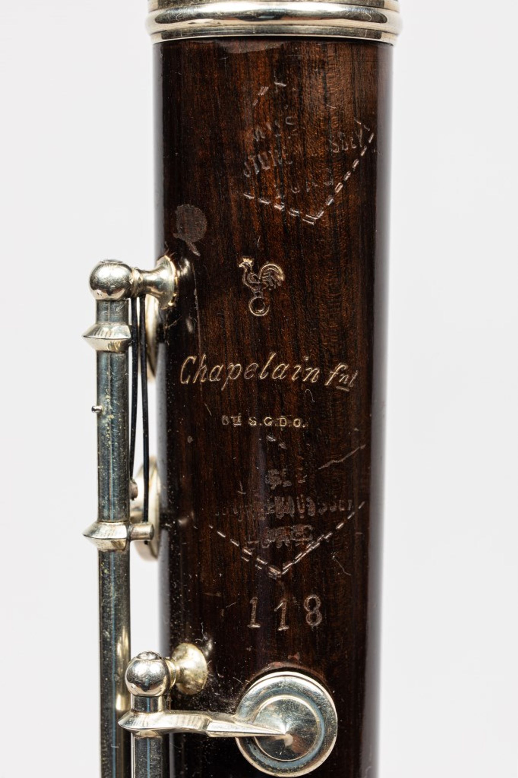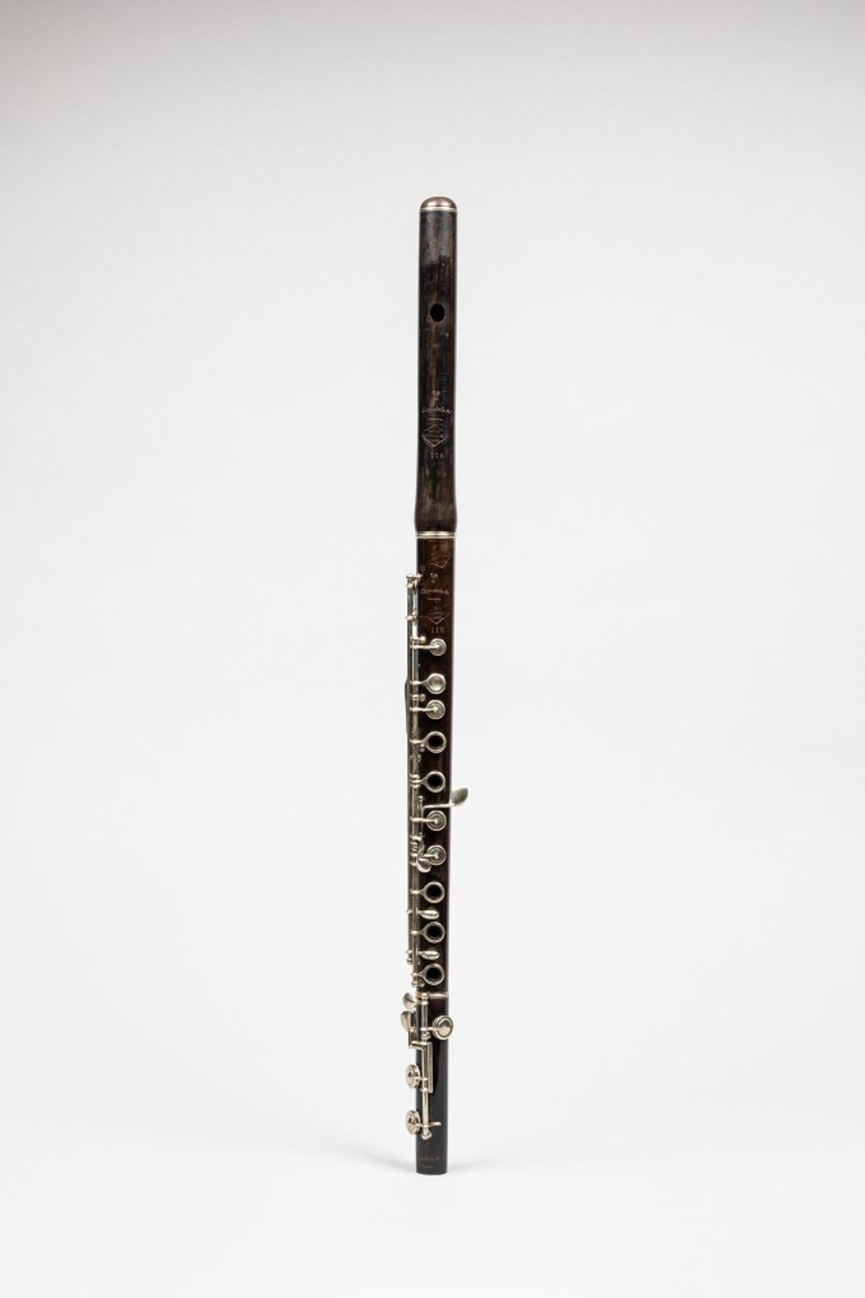 Tête, corps et patte en buis, 3 bagues en maillechort, système Boehm.