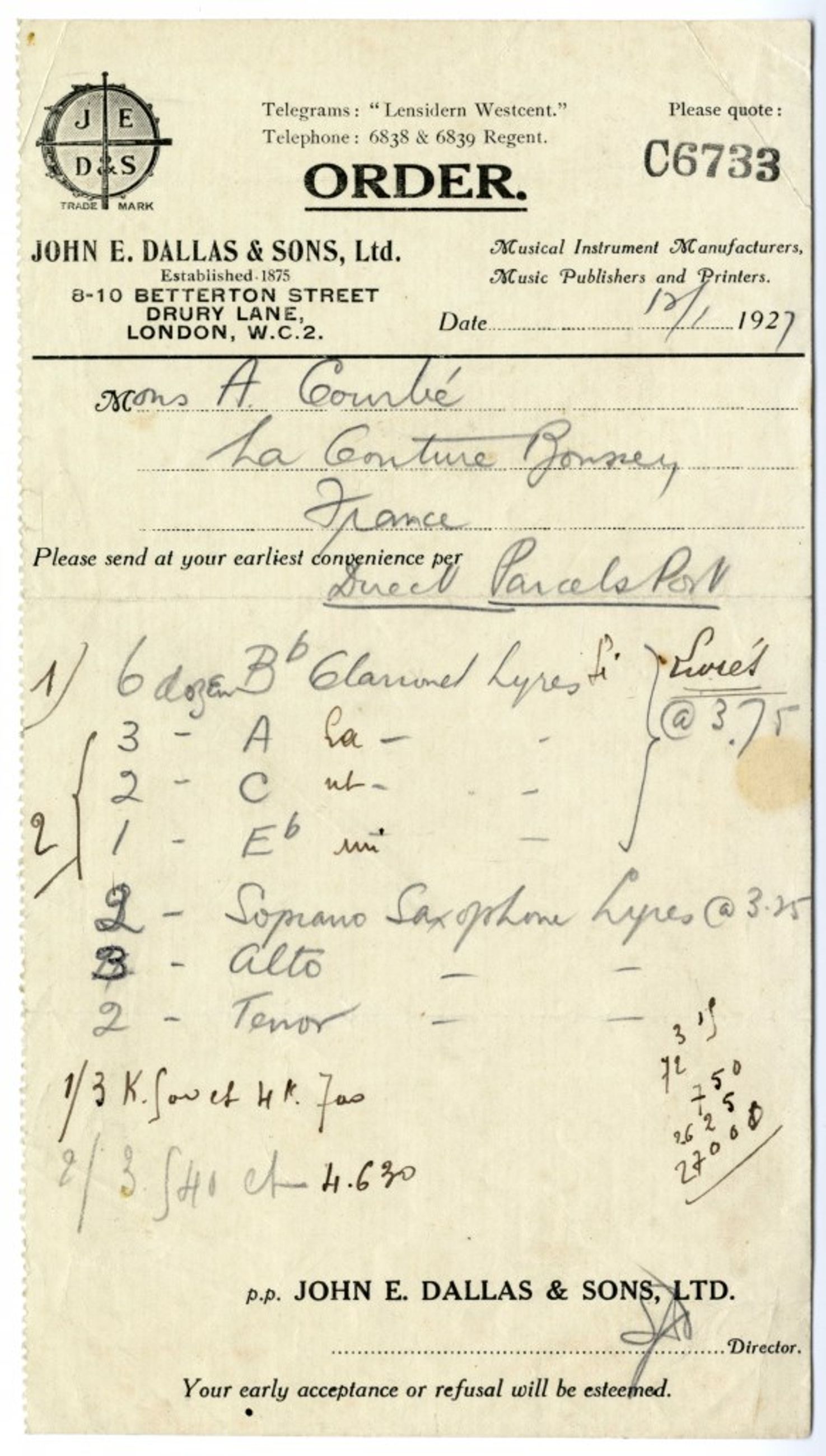 Bon de commande envoyé par le magasin de musique "John E. Dallas & Sons, Ltd" à destination d'A. Courbe le 18 janvier 1927.