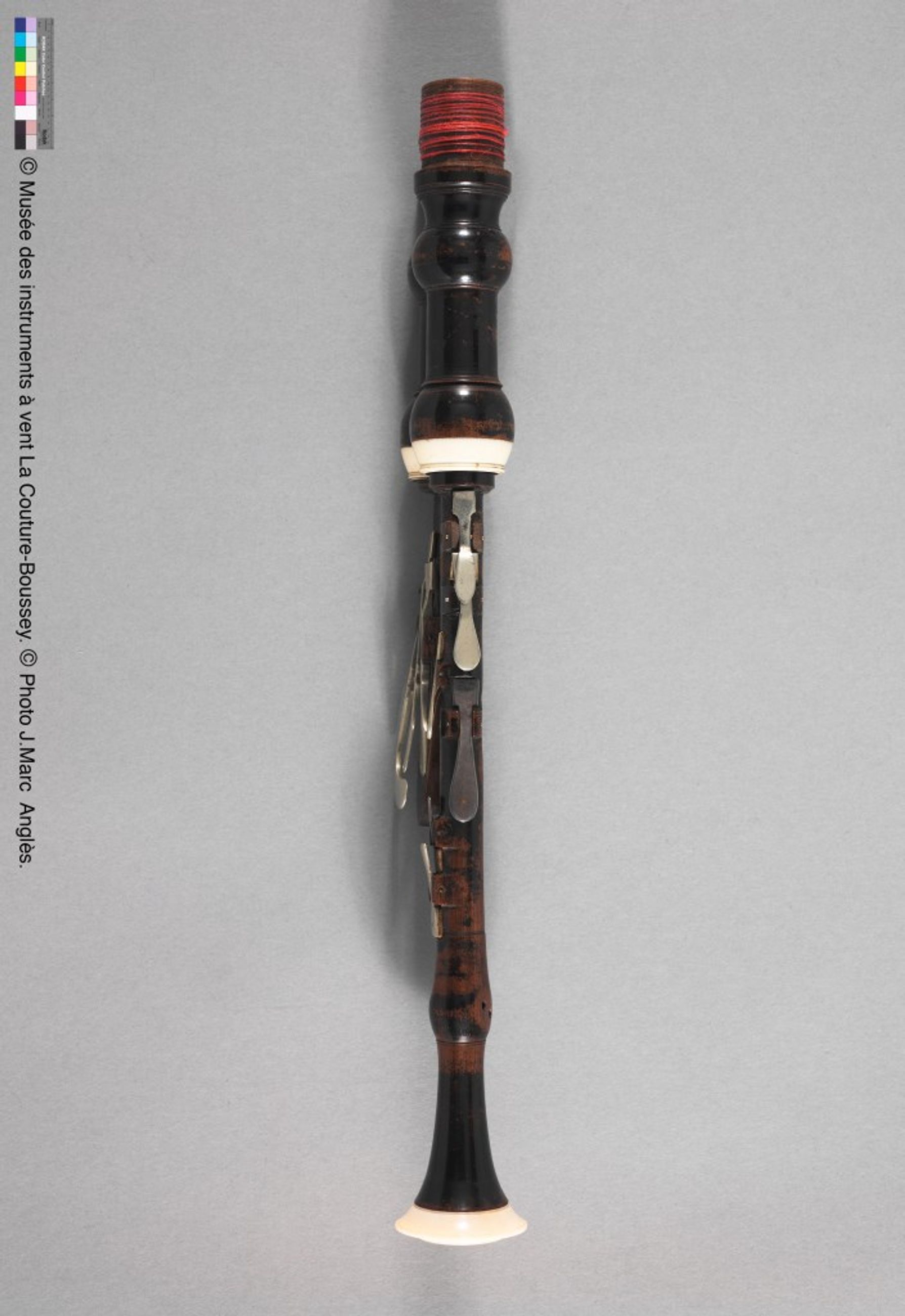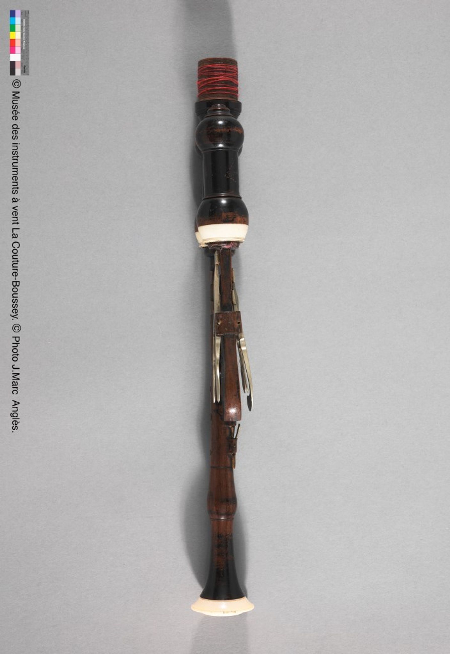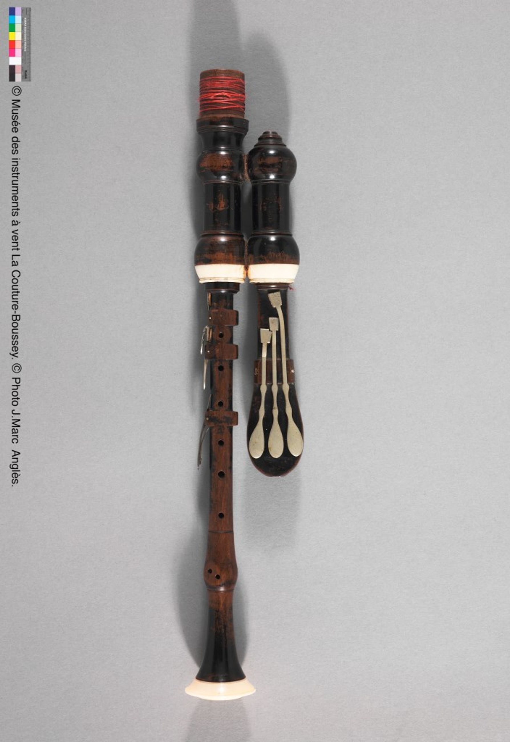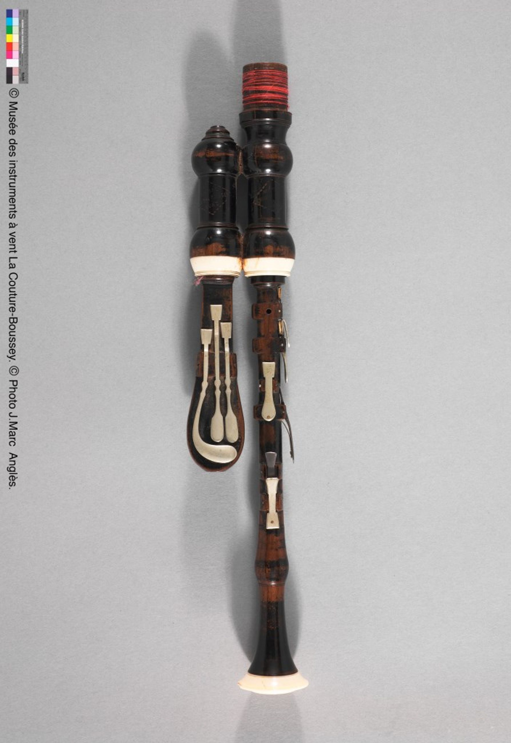 très élégant, il est composé de deux chalumeaux en bois de fruitier teintés, moulurés et réunis au sommet et d’une boîte à bourdon cylindrique avec layettes. Layettes et viroles sont en ivoire, les clefs en argent.