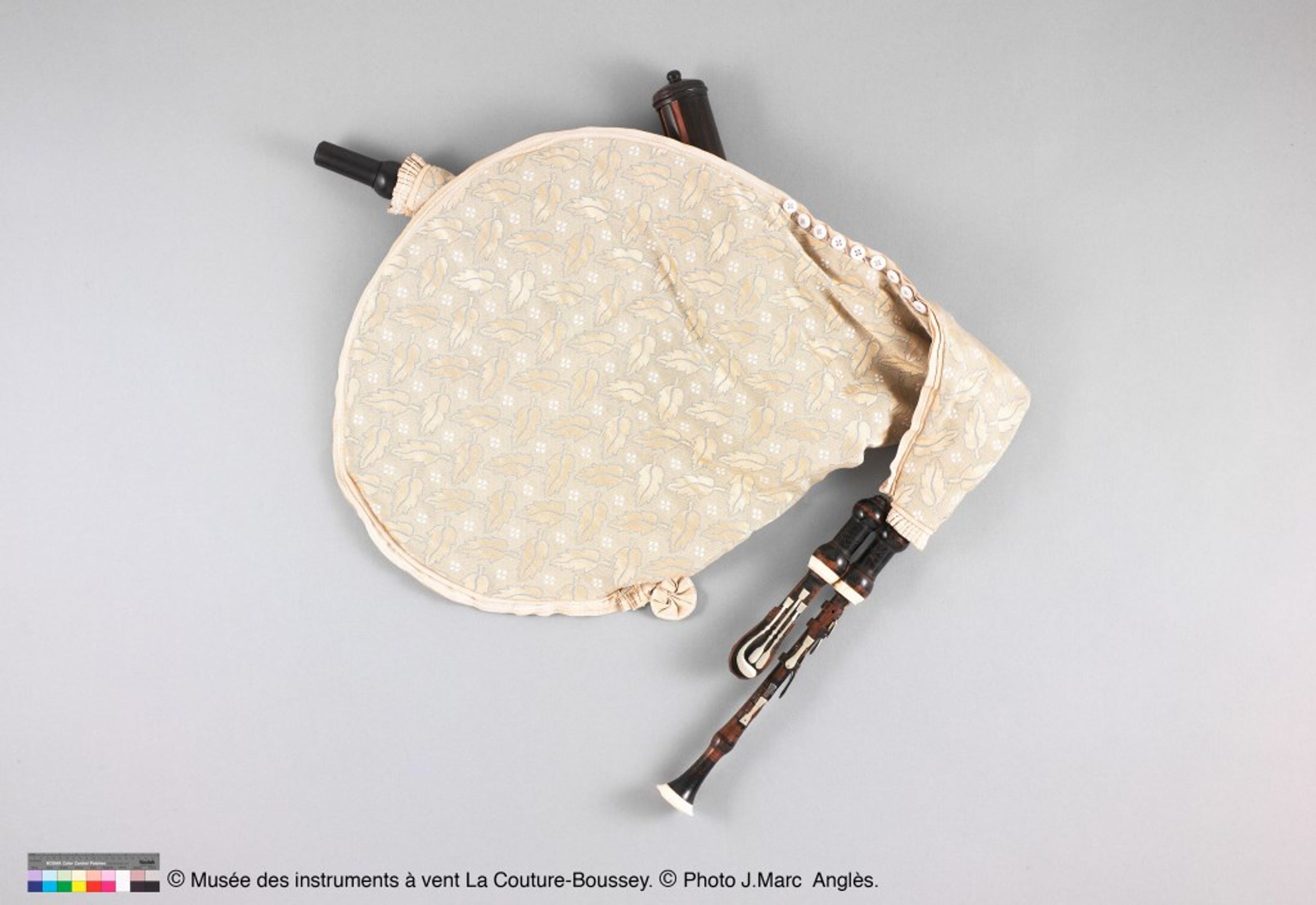 boîtes, porte-vent et la couverture) étaient manquants. Les éléments d’origine, c’est-à-dire le jeu de chalumeaux et le bourdon (inv. 387), furent probablement construits par Louis Laubé et Nicolas Mauger, deux facteurs de La Couture-Boussey à l’occasion de la fondation du musée, comme en témoigne une marque au fer. Comme pour d’autres instruments, les facteurs durent s’inspirer d’un autre instrument, peut-être provenant d’une des collections privées qui constituèrent la source de plusieurs copies du musée. Instrument simple et en même temps