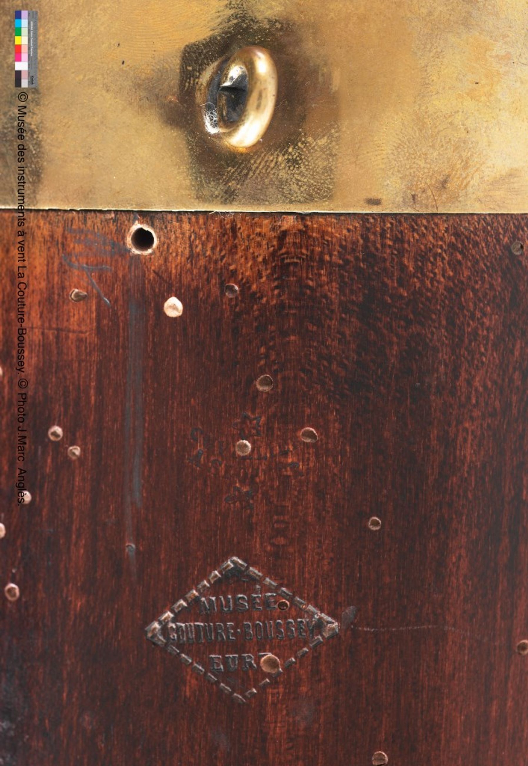 Estampilles "[étoile] / CUVILLIER / A ST OMER / [étoile] " sur la culasse, "(dans un losange en tiret) MUSÉE / COUTURE-BOUSSEY / EURE" sur la grande branche et la culasse, marquage "391" sur la petite branche, la grande branche, la culasse et le pavillon.