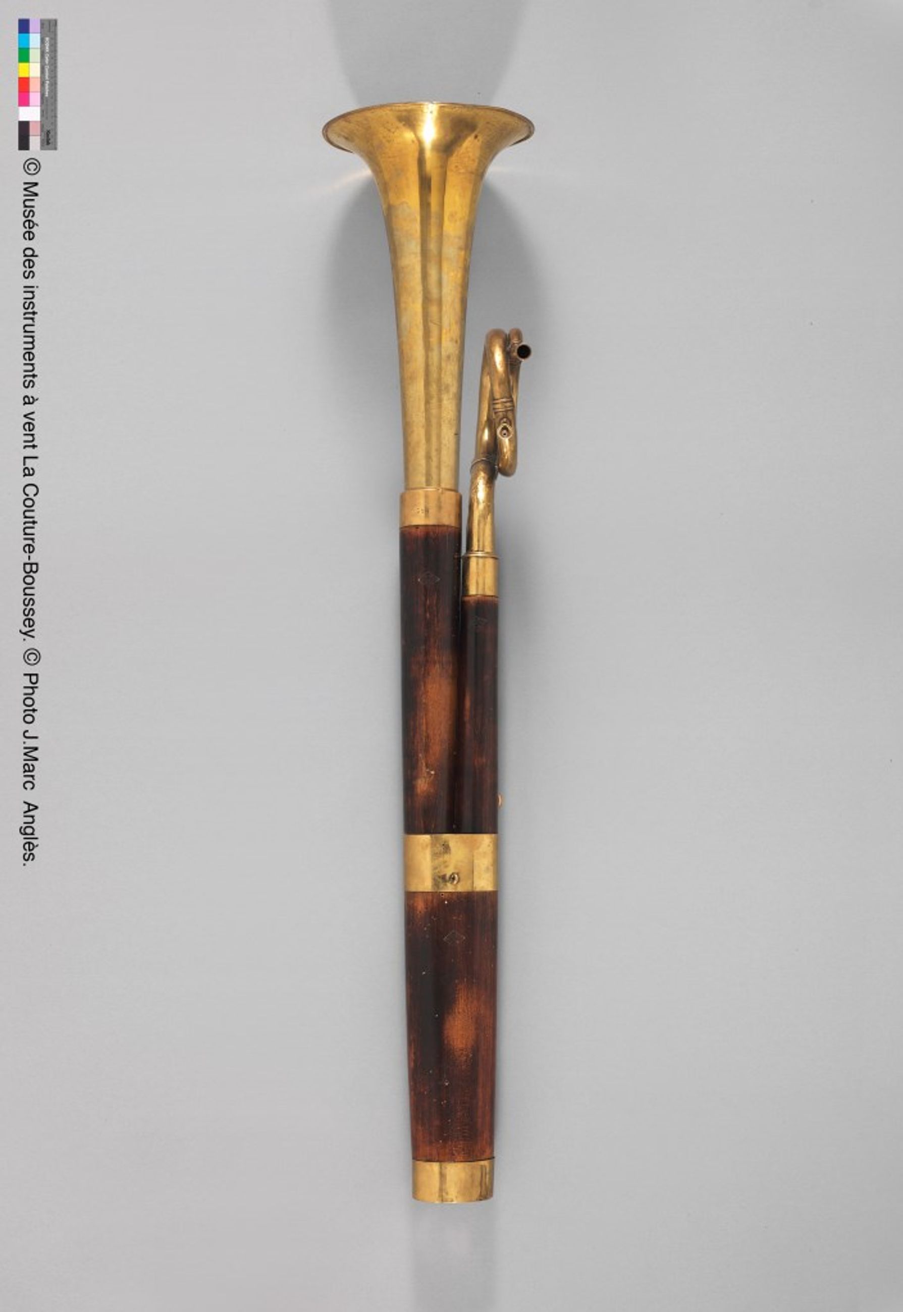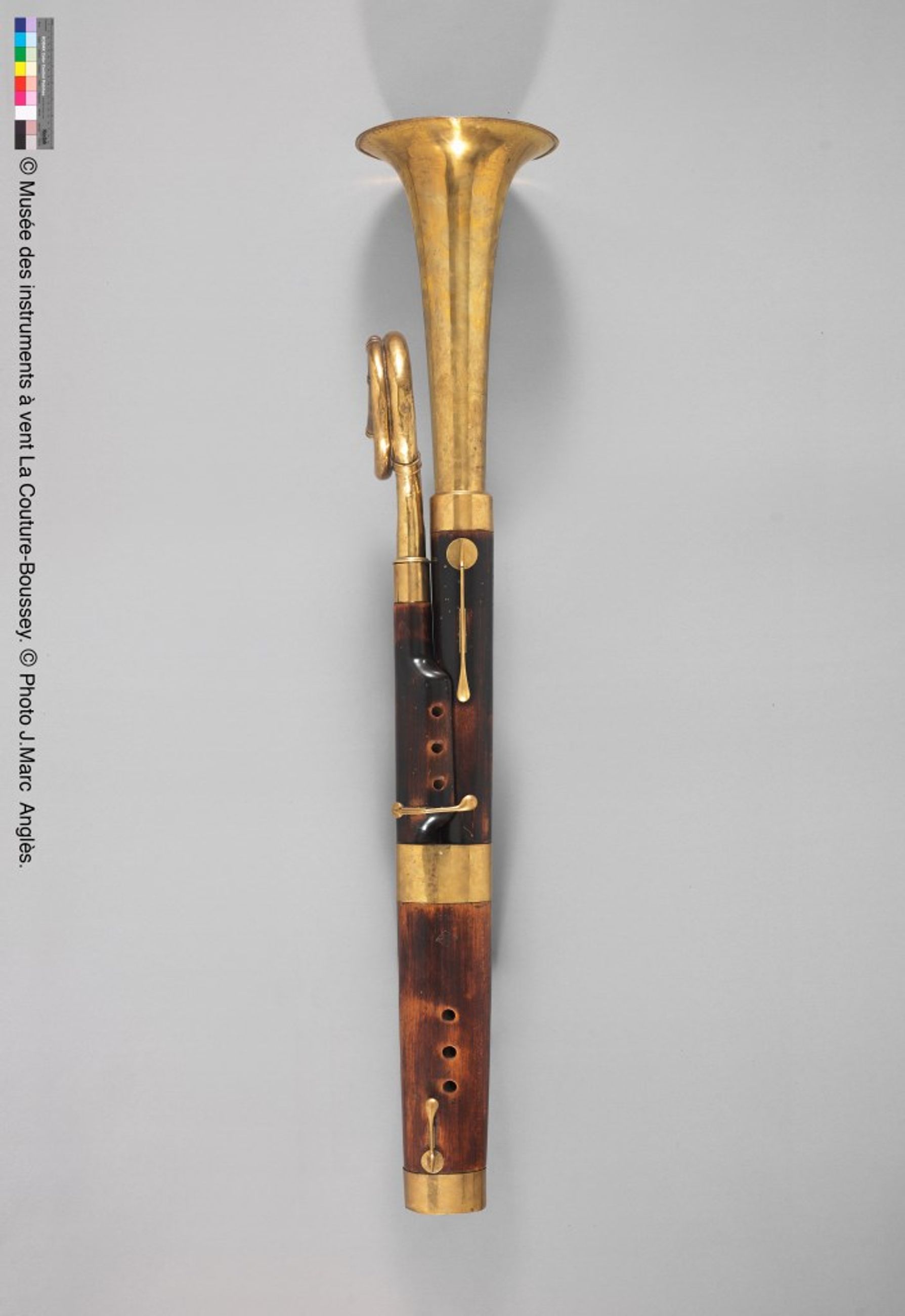 Bocal circulaire à demi enroulé en laiton, petite et grande branches en érable, culasse en bois bruni, pavillon conique en laiton, 4 viroles en laiton, 3 clefs plates rondes en laiton montées sur boules et fixées sur des patins, 6 trous de jeu.